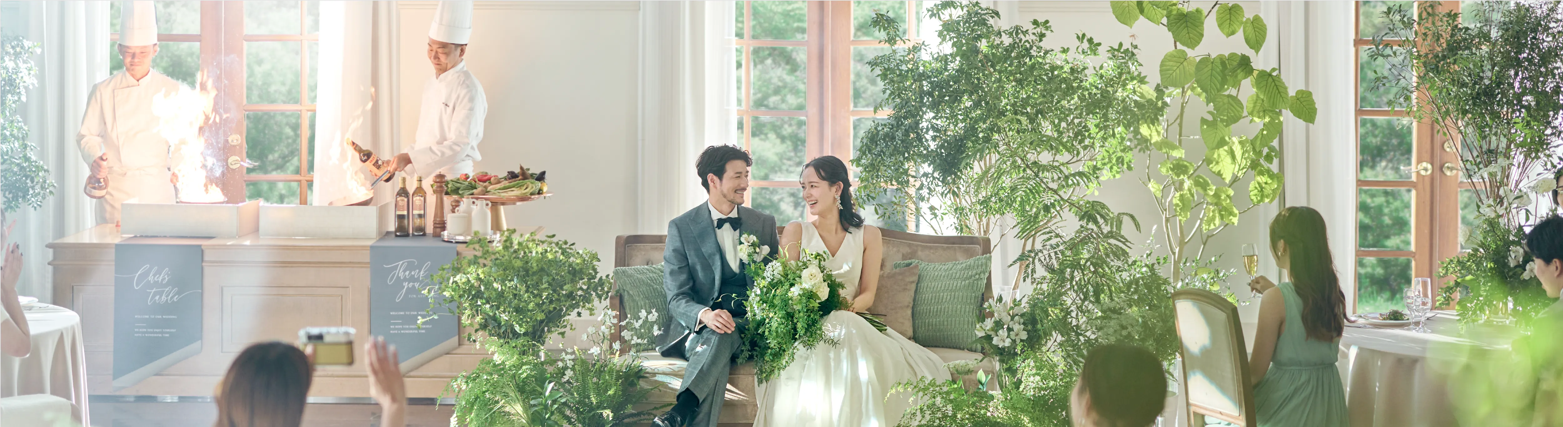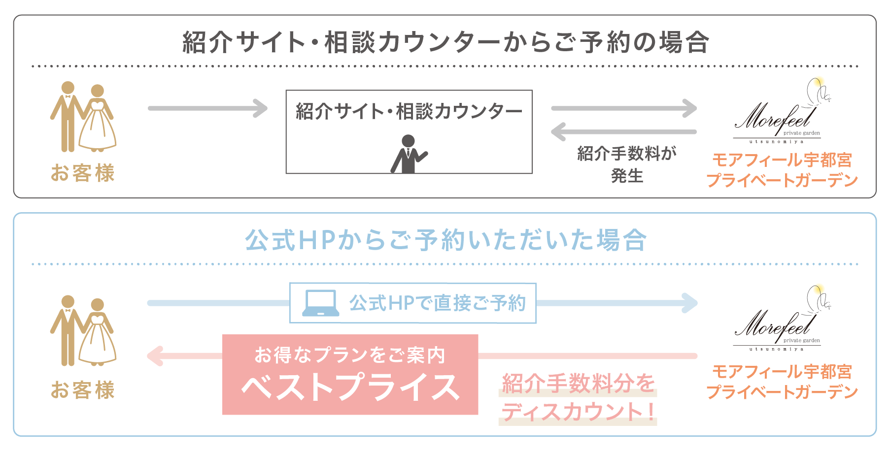 式場紹介・相談カウンターからのご予約や式場比較サイトからのご予約に比べて、当公式HPでご予約いただくと仲介手数料がかからないため、お客様に100%還元したプランをご案内することができます。